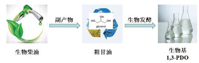 每吨生物柴油大约副产100kg甘油,因此由生物柴油得到的粗甘油再经生物发酵制备1,3-PDO具有-定的成本优势。2011年, 江苏盛虹集团与清华大学合作,以生物柴油副产物甘油为原料生产1,3-PDO,建成了3万吨/年的生产装置。