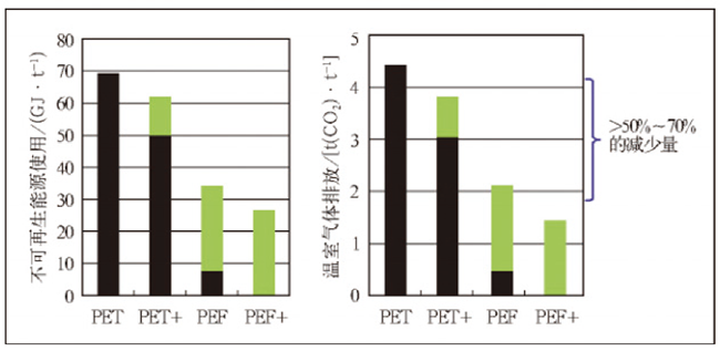 图9.石油基PET和生物基PET、PEF的不可再生能源使用和温室气体排放量的比(哥白尼可持续发展研究所评估结果)