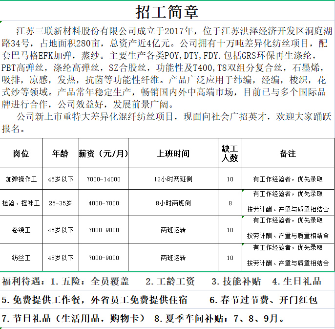 公司新上市重特大差异化混纤纺丝项目,现面向社会广招英才,欢迎大家踊跃报名。